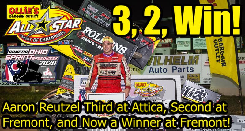 FREMONT, Ohio (July 5, 2020) - The third try was definitely the charm for Clute, Texas-native Aaron Reutzel, as the two-time and defending Ollie’s Bargain Outlet All Star Circuit of Champions presented by Mobil 1 titleholder finally cracked into the 2020 Cometic Gasket Ohio Sprint Speedweek presented by Hercules Tires win column, doing so with a victory at Fremont Speedway in Fremont, Ohio, on Sunday evening, July 5.