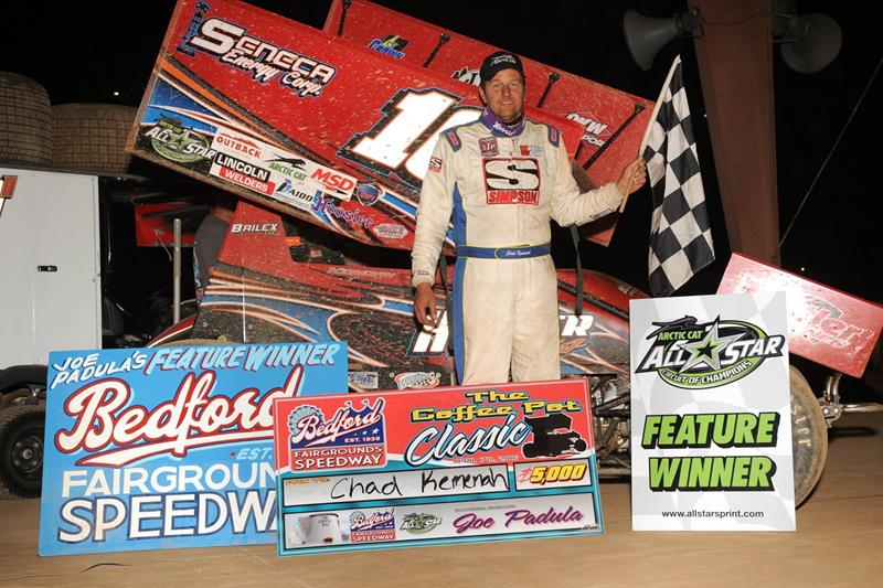 BEDFORD, Pa. (April 17, 2016) - Alveda, Ohio’s Chad Kemenah invaded “Pennsylvania Posse” country with the Arctic Cat All Star Circuit of Champions on Sunday evening and left as a Coffee Pot Classic champion. Kemenah, a former four-time All Star titlist, led all 25 laps of the non-stop Coffee Pot Classic main event at the Bedford Fairgrounds Speedway on Sunday evening, April 17, securing a spot in Arctic Cat All Star victory lane for the 30th time in his storied career; his first of the 2016 season and his first on the Bedford, Pennsylvania, half-mile. With the victory, Chad Kemenah officially takes command of the current Arctic Cat All Star Circuit of Champions point standings, holding a 10 point advantage over defending series champion Dale Blaney.